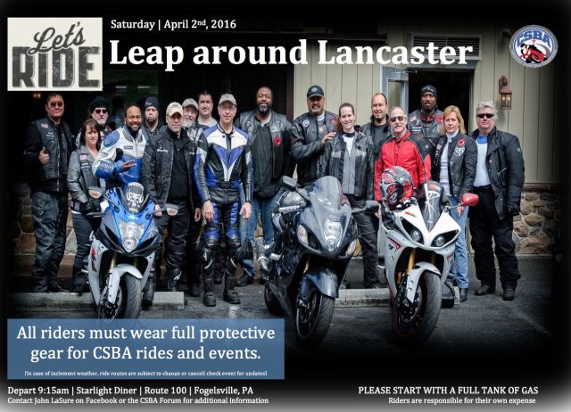 ** ALERT** The April 2nd CSBA Ride “Leap around Lancaster” season opening ride has been CANCELED due to weather and road conditions. We will still be holding our morning breakfast at Starlite Diner for all that want to come out and enjoy some time together. I will have Raffle Tickets and a few 2016 CSBA Calendars with me and also the checklist for those submitting their ticket stubs. I'm sorry to cancel, but I always error on safety for our rides. Enjoy us for our next scheduled ride: May 7th CSBA Ride “Blue Mountain Run”, which is always a winner - plus our next scheduled CSBA Day at the Races is scheduled for May 13-14th at NJMP Lightning. See you tomorrow at the Starlite Diner if you decide to come out.
