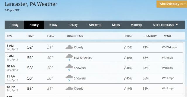 weather.com/weather/hourbyhour/l/USPA0857:1:US - For the Lancaster Area - as of 7:45p this evening. With the roads already in halfway condition, the morning is mainly a washout. I won't officially cancel until 5:30am tomorrow, but based on this information - it's most likely a NO GO for tomorrow's ride.