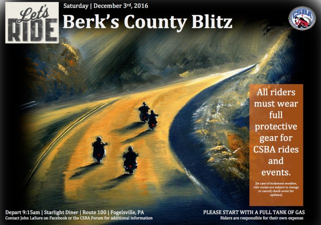 On Saturday, December 3rd, the Eastern Pennsylvania Chapter of the Christian Sport Bike Association will be having it’s final scheduled ride of the year - our December Monthly Ride - The “Berks County Blitz”. We will be meeting at the Starlight Diner in Fogelsville for breakfast around 8am and the ride plans to depart at 9:15am, so please be ready. Late comers might get left, so don't be late!