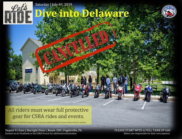 Due to Severe and Heavy Thunderstorms forecasted across the region, our CSBA Ride "Dive into Delaware" has been CANCELED. We are still planning to meet for breakfast at our normal spot (Starlight Diner) @ 9am - all are welcome! If you can't make it down for breakfast, we look forward to seeing you next month, on our normal scheduled ride. If we can't ride - let's eat!