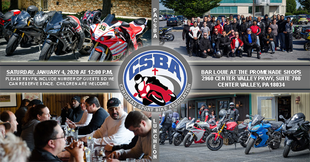 You are invited to join us for lunch at 12:00 p.m. on Saturday, January 4th, 2020 at Bar Louie, 2960 Center Valley Parkway, Suite 700, Center Valley, PA 18034. We will be discussing the upcoming riding season while enjoying good food and company with our friends and family. This event provides a great opportunity to meet new friends and learn more about the CSBA as an organization (www.pacsba.org). You will meet some of our ride leaders, learn more about our CSBA Day at the Races track day venues, and most importantly – reconnect and make some new friends that share your passion of riding.